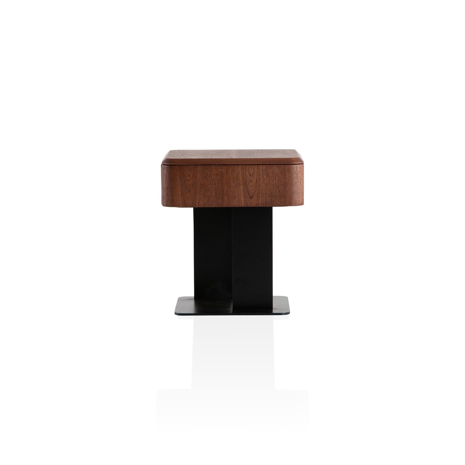 Constructed from an E1 grade high-density board with walnut veneer, supported by a solid steel base. The timber volume is elevated on paired vertical supports, creating a clear separation between storage mass and structure. Proportion and material contrast define the piece, balancing warmth of timber with the rigidity of steel.