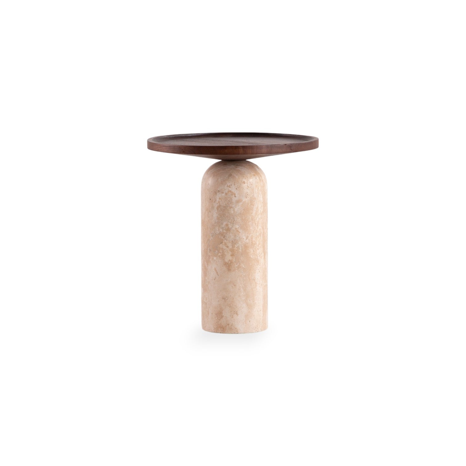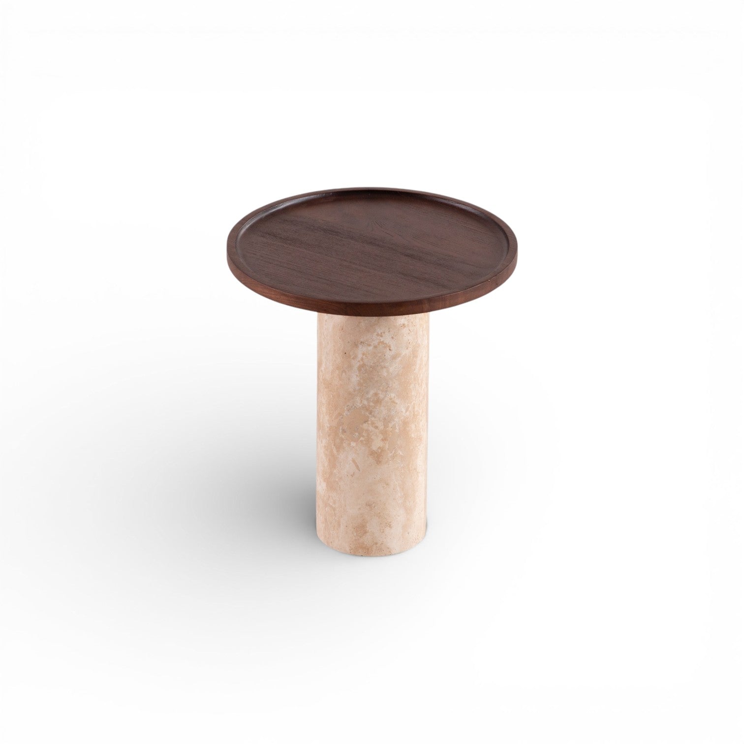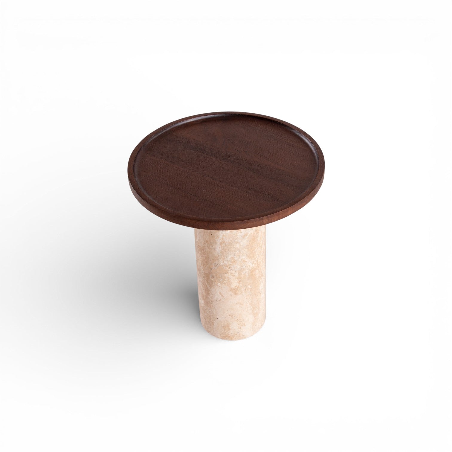 Constructed from a solid cylindrical travertine base with a recessed elm wood top. The form is reduced and vertically oriented, with mass and proportion defining its presence. Material contrast is expressed through surface and junction, allowing stone and timber to read independently while functioning as a single object.